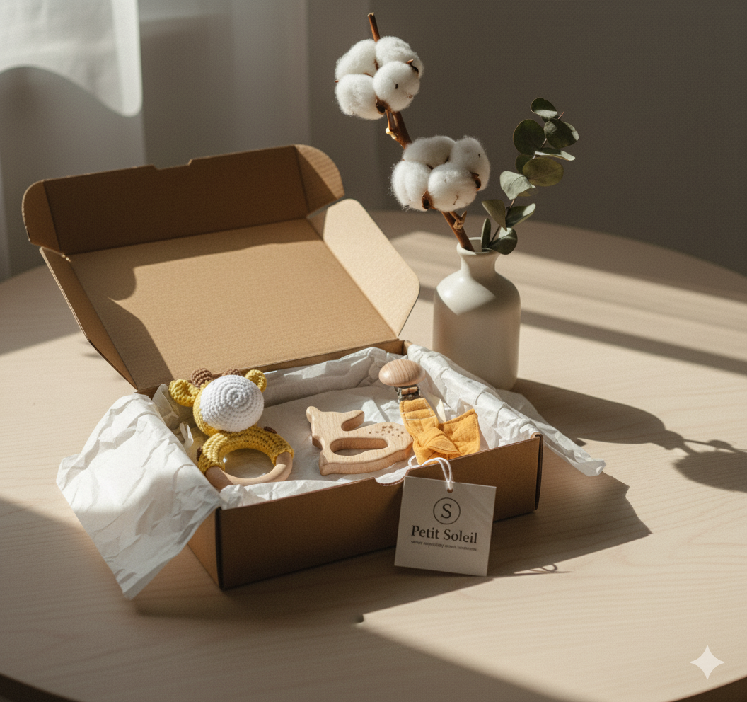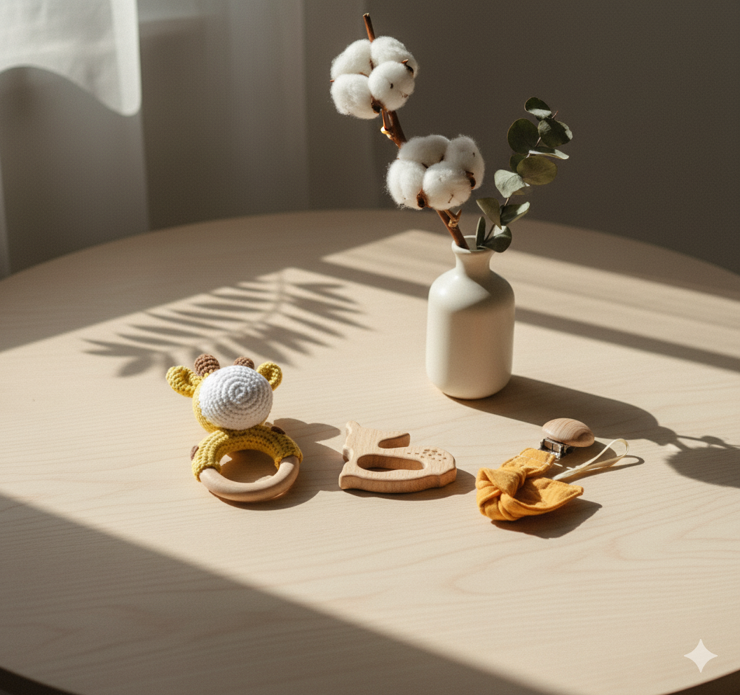 Handcrafted with 100% cotton crochet and premium beechwood, this 3-piece set supports sensory exploration, early motor skills and soothing comfort for babies 0–12 months.