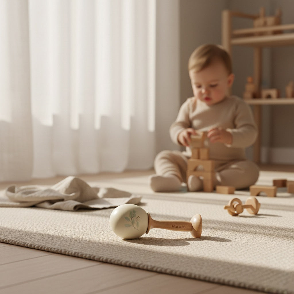 Delicately painted with soft watercolor tones, this wooden egg maraca invites your child into the world of rhythm and gentle sound.
